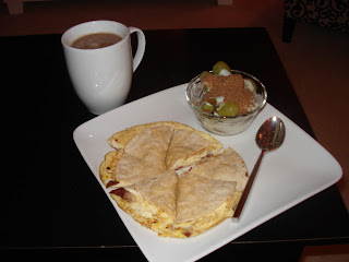 Husband made me breakfast this morning, so of course it involved egg. We used up the corn tortillas from last night's tacos. They are only 45 calories each and as far as I know, a whole grain. (Correct me if I'm wrong). He put an egg plus some egg white, a laughing cow, and a slice of turkey bacon between the tortillas. I had them with a side of kiwi and grapes topped with a shot of Kefir and some flax and a latte. The corn was delicious for breakfast - kind of like tortilla chips!